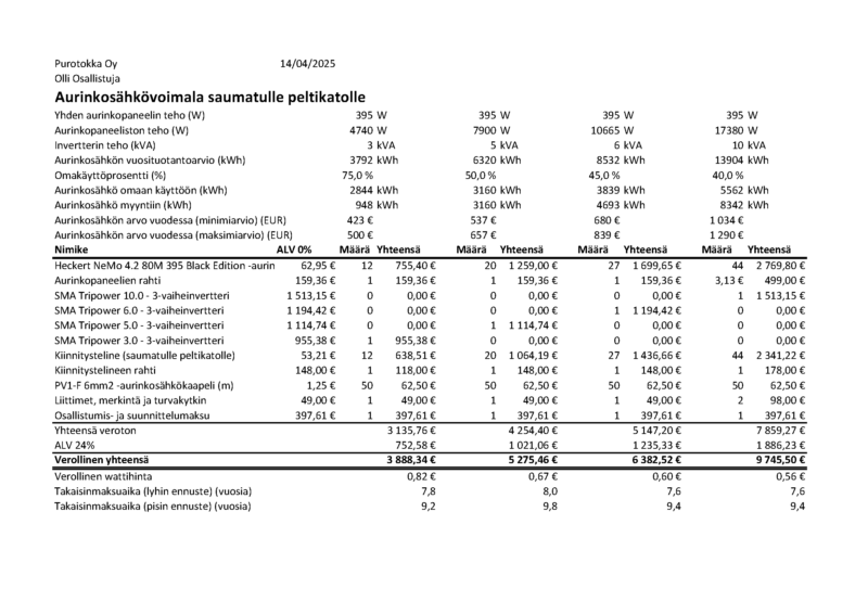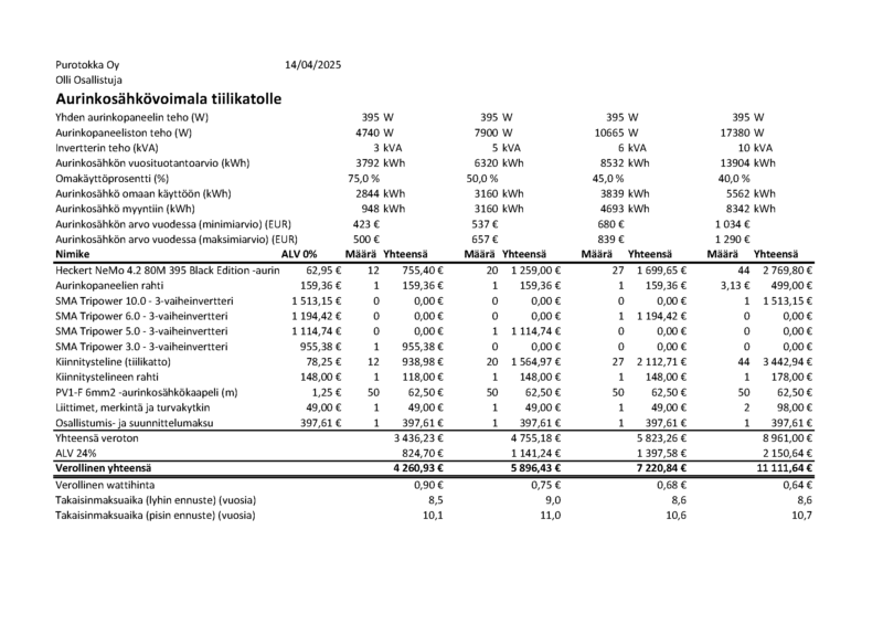 Olen koonnut tälle sivulle esimerkkihinnat neljälle erikokoiselle aurinkovoimalalle, jotka on suunniteltu asennettavaksi erilaisille kattotyypeille – profiilipeltikatolle, bitumikatolle, tiilikatolle ja saumatuille peltikatoille (kuten konesauma- ja lukkosaumakatoille) – sekä itse rakennettavan maatelineen päälle. Kaikki laskelmissa käytetyt komponentit ovat laadukkaita saksalaisten valmistajien tuotteita. Ajatuksena on investoida kerralla hieman enemmän korkeaan laatuun, jotta voidaan nauttia pidemmästä käyttöiästä ja huolettomasta toiminnasta sen sijaan, että rakennusvaiheessa tingittäisiin laadusta. Käytetyt valmistajat ovat SMA (invertterit), Schletter (kiinnitystelineet) ja Heckert (aurinkopaneelit).