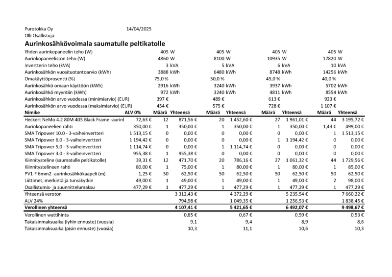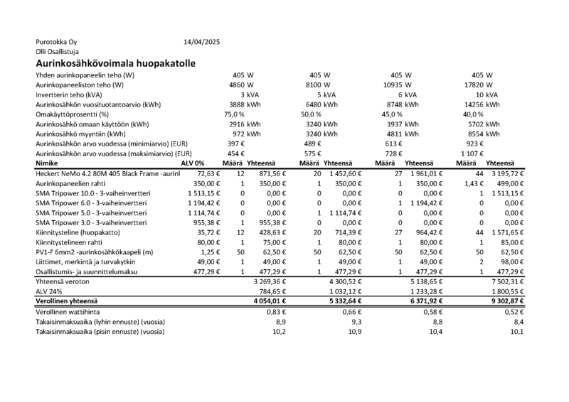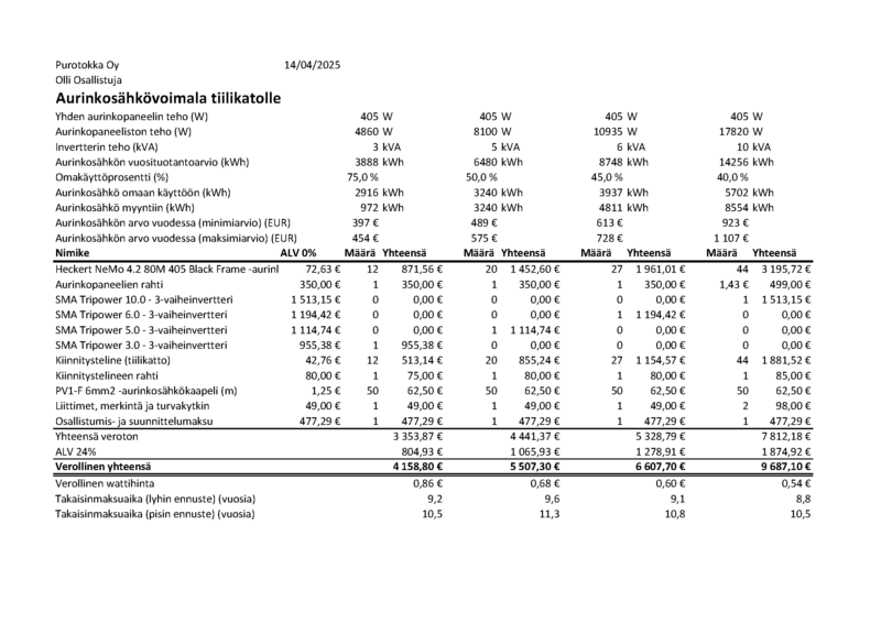 Olen koonnut tälle sivulle esimerkkihinnat neljälle erikokoiselle aurinkovoimalalle, jotka on suunniteltu asennettavaksi erilaisille kattotyypeille – profiilipeltikatolle, bitumikatolle, tiilikatolle ja saumatuille peltikatoille (kuten konesauma- ja lukkosaumakatoille) – sekä itse rakennettavan maatelineen päälle. Kaikki laskelmissa käytetyt komponentit ovat laadukkaita saksalaisten valmistajien tuotteita. Ajatuksena on investoida kerralla hieman enemmän korkeaan laatuun, jotta voidaan nauttia pidemmästä käyttöiästä ja huolettomasta toiminnasta sen sijaan, että rakennusvaiheessa tingittäisiin laadusta. Käytetyt valmistajat ovat SMA (invertterit), Moisolar / Schletter (kiinnitystelineet) ja Heckert (aurinkopaneelit).