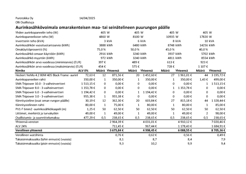 Olen koonnut tälle sivulle esimerkkihinnat neljälle erikokoiselle aurinkovoimalalle, jotka on suunniteltu asennettavaksi erilaisille kattotyypeille – profiilipeltikatolle, bitumikatolle, tiilikatolle ja saumatuille peltikatoille (kuten konesauma- ja lukkosaumakatoille) – sekä itse rakennettavan maatelineen päälle. Kaikki laskelmissa käytetyt komponentit ovat laadukkaita saksalaisten valmistajien tuotteita. Ajatuksena on investoida kerralla hieman enemmän korkeaan laatuun, jotta voidaan nauttia pidemmästä käyttöiästä ja huolettomasta toiminnasta sen sijaan, että rakennusvaiheessa tingittäisiin laadusta. Käytetyt valmistajat ovat SMA (invertterit), Moisolar / Schletter (kiinnitystelineet) ja Heckert (aurinkopaneelit).